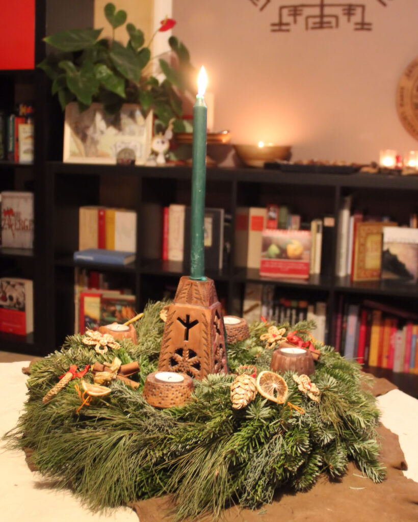 In meiner Familie steht zur Julzeit ein Leuchter im Mittelpunkt des Kranzes – ein schlichtes, erdverbundenes Gefäß, das wir Julleuchter nennen. Vier Kerzen außen begleiten die Wochen im Advent bis zur Sonnenwende. An Jul selbst erlöschen sie – eine nach der anderen – bis nur noch die Dunkelheit bleibt.